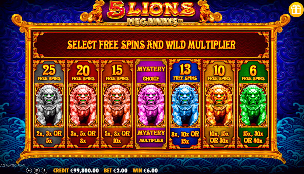 Free spins in 5 Lions Megaways are triggered when you land three or more scatter symbols during one spin. Once activated, you can choose from several different free spin modes to match your playing style.