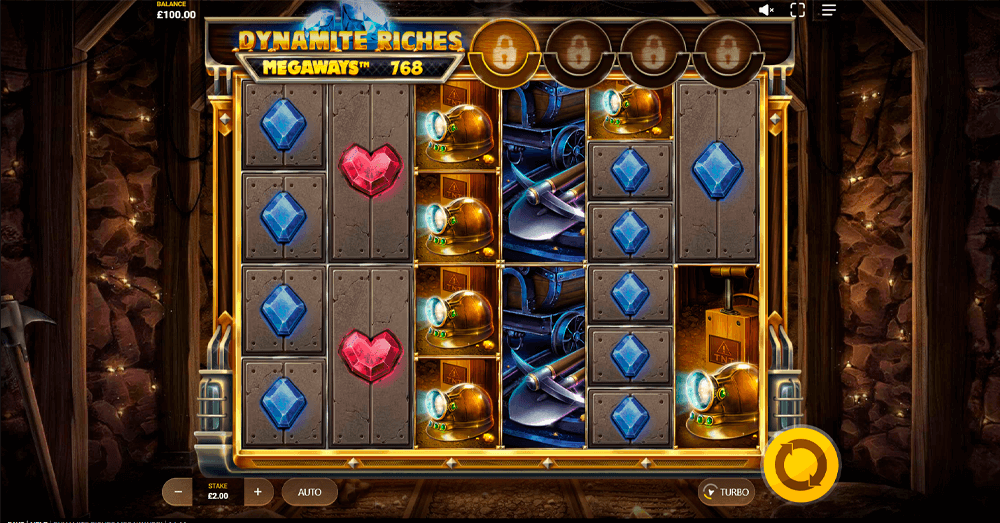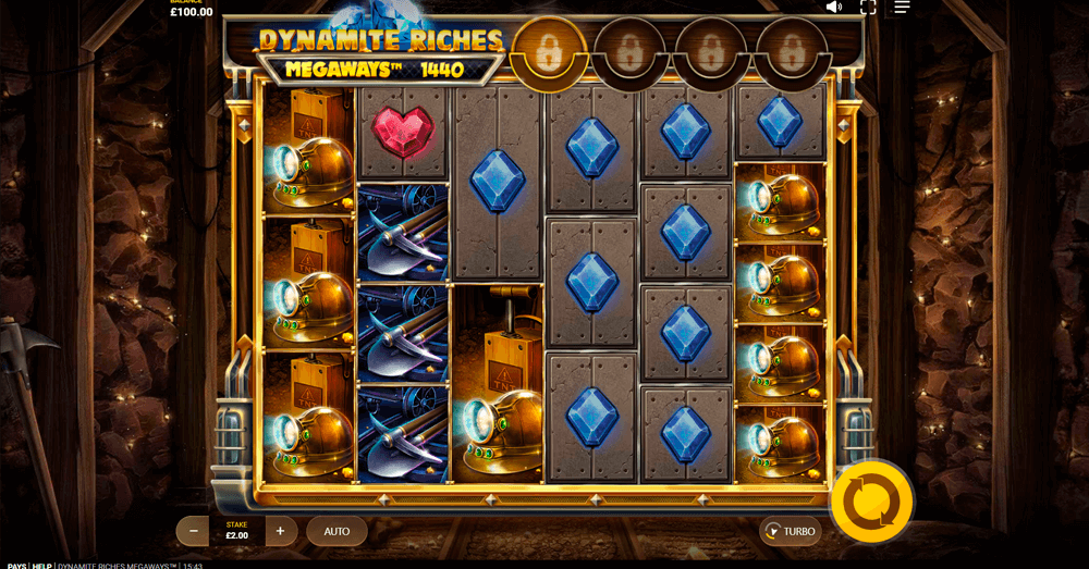 Dynamite Riches Megaways uses a range of themed symbols, including mining equipment, gold bars, helmets, and playing card icons. Each symbol comes with its own payout value, and special bonus symbols unlock extra rewards and features within the game. Find more information about individual symbol payouts in the paytable below.