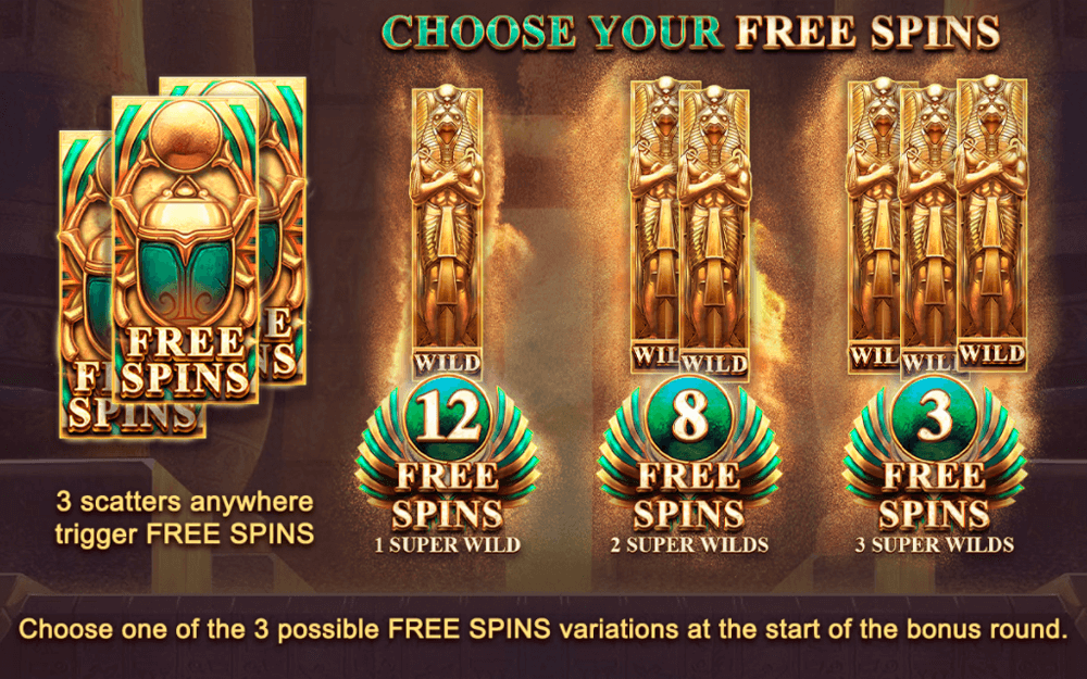 - Free Spins with Choice. When you activate the free spins bonus, you get to choose between 12 free spins with one Super Wild, 8 free spins with two Super Wilds, or 3 free spins with three Super Wilds. This lets you tailor the bonus round to your risk preference and playing style.